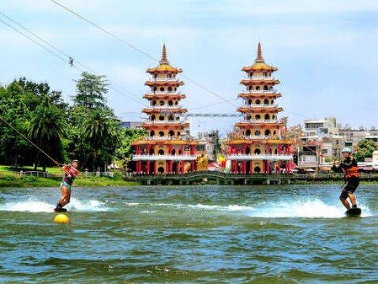 蓮池潭 舊稱蓮花潭,位於高雄市左營區東側,南鄰龜山、北接半屏山,潭面面積約42公頃,源於高屏溪。蓮池潭周邊潭水因遍植荷花,在清領時期就名列鳳山八景,稱「泮水荷香」,現因湖畔半屏山特殊造型與龍虎塔遠近倒映水中,而以「蓮潭夕照」聞名。入夜後的蓮池潭,水霧濛濛,景色若隱若現,予人難以言喻的神秘感。 潭上亭台樓閣林立,潭畔遍植垂柳,景緻秀麗。由南而北風景點分別有舊城、龍虎塔、五里亭、春秋閣、啟明堂、孔廟等,吸引各地遊客前往,假日更是絡繹不絕。 春秋閣 春秋閣建於民國42年(西元1953年)為兩座宮殿式樓閣,為春閣及秋閣之合稱,各為四層八角,綠瓦黃牆,宛如寶塔,古色古香的塔影倒映水中,造型為當時全臺灣塔中之翹楚。各有九曲橋相通,又稱「春秋御閣」,係為紀念武聖關公而建。 位在春秋閣的前端有一尊騎龍觀音,關於此一騎龍觀音的由來有一傳說:觀音菩薩曾騎龍在雲端現身,指示信徒要依其現身之形態建造聖像在春閣與秋閣之間,於是有現今的騎龍觀音聖像。 龍虎塔 塔高七層,潭水上立有龍虎兩孿生閣樓,樓前各有龍虎塑像,遊客可以身為道,由龍口進,虎口出,取其吉祥之意。塔身與岸邊有九曲橋銜接,巍峨聳立,與潭面相互對應,景緻優美。